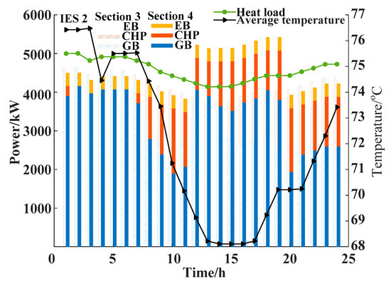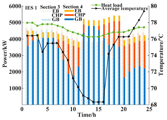 The thermal energy optimization of Section 3 and Section 4 is shown in Figure 16 and Figure 17. Due to the lack of consideration for the dynamic characteristics of the heating network in Section 3, the total heat output of the units in each period is equal to the heat load. During the 12:00~19:00 period, Section 4 stores the remaining thermal energy produced by CHP, GB, and EB. Release from 0:00 to 11:00 and 20:00 to 0:00 to supplement the portion of heat energy that is less than the heat load of the unit, thereby reducing pipeline heat loss and heating costs. The average temperature changes with the storage and release of heat energy. Comparing the variation curves of heat load and temperature, the thermal delay characteristic results in partial temperature delay.