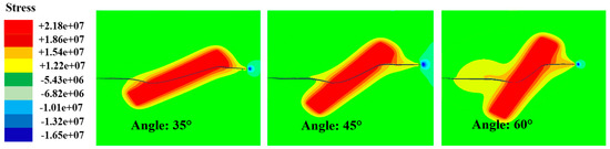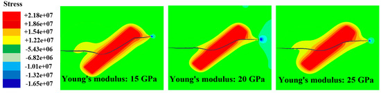 Through studies on the relationship between the Young’s modulus of fault fracture zones and fracture deflection amplitude, it has been discovered that as the Young’s modulus of fault fracture zones increases, the fracture deflection amplitude slightly decreases (as shown in Figure 3). When Young’s modulus rises, the rigidity of the fracture zone is enhanced. This increased stiffness suppresses energy concentration at the fracture tip and reduces local deformation capacity near the fault plane, thereby narrowing the stress field range at the fracture tip and diminishing the fracture deflection angle.