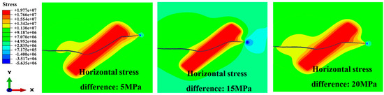 Through investigations on the horizontal stress difference in fault fracture zones, it has been found that as the horizontal stress difference increases, the fracture deflection amplitude decreases, with fractures tending to directly penetrate through the fault fracture zone, as shown in Figure 4. Elevated stress differences strengthen the dominance of the maximum principal stress in fracture propagation and weaken the disturbance from the boundary stress field of the fracture zone on the fracture tip. This accelerates the decay rate of the shear component in fracture tip stress intensity, thereby inhibiting fracture deflection. Increased horizontal stress difference drives the energy release rate distribution at the fracture tip toward anisotropy, promoting fracture propagation along the direction of maximum principal stress.