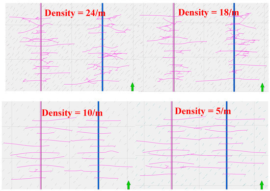 Through fracturing simulations conducted on four sets of parent–child well groups, the study demonstrates that the development of natural fractures between wells leads to non-uniform propagation of hydraulic fractures. Figure 6 shows that the degree of natural fracture development significantly influences interference intensity by controlling both the propagation paths and energy distribution of hydraulic fractures. During the low fracture density stage, hydraulic fractures preferentially propagate along high-conductivity natural fractures, forming elongated main fracture networks, with interference probability rising significantly as density increases. When fracture density further increases, the fractal dimension of fracture networks grows. Multi-stage branching fractures intensify fluid energy dissipation, resulting in reduced main fracture extension length and localized enrichment of fracture networks around wells, consequently lowering interference probability [25].