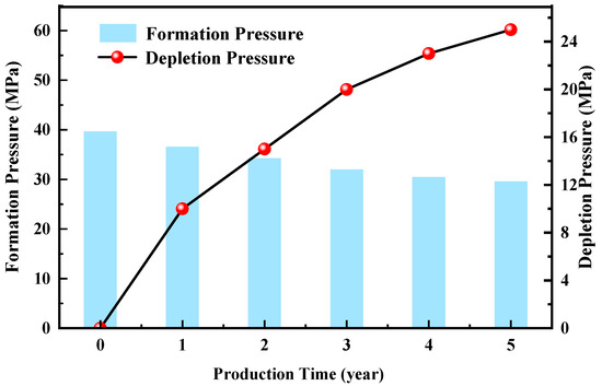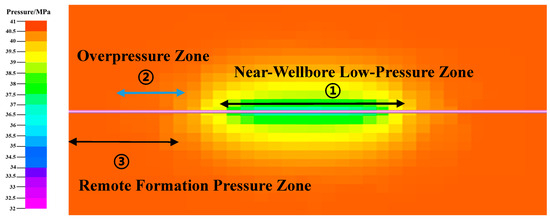 Numerical simulations of formation pressure distribution after long-term production in legacy wells revealed three distinct pressure zones radiating outward from the stimulation center, as shown in Figure 7: ① a low-pressure zone induced by production, ② a high-pressure zone created by fracturing fluid injection, and ③ the far-field formation pressure zone [27].