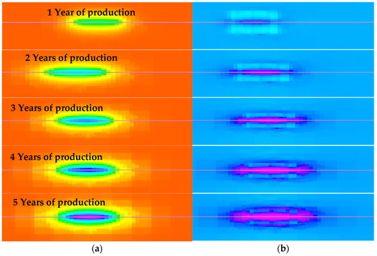 Evolution of formation pressure and minimum horizontal principal stress field during 1–5 years of parent well production. (a) Formation pressure. (b) Minimum horizontal principal stress.