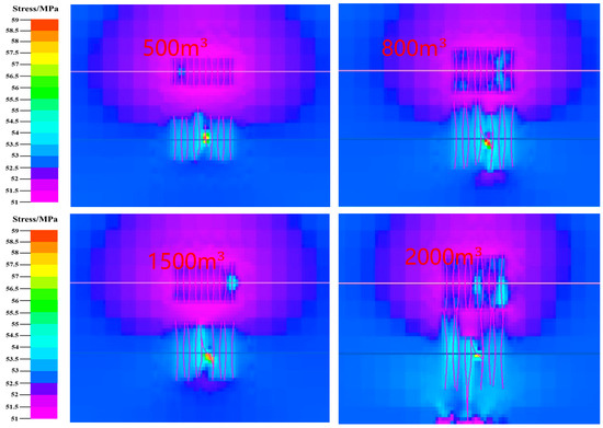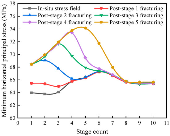 Distribution of minimum horizontal principal stress in parent–child wells under different fracturing fluid injection volume.