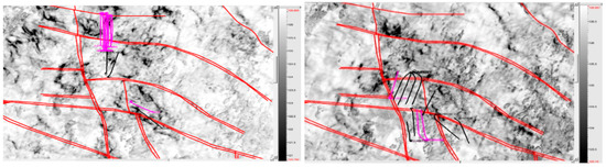 Through research on fault softening effects that attract and truncate hydraulic fracture propagation, it has been determined that when fractures are arranged perpendicular to faults, controlling the fracturing scale can weaken the fault’s influence by limiting fracture extension to inhibit direct contact between fracture tips and fault planes, thereby reducing the disturbance range of shear stress; when fractures are arranged parallel to faults, reducing fluid intake in peripheral fractures mitigates fault effects through selective plugging of edge perforation clusters using diverting agents or adjusting fluid viscosity distribution to prioritize central fracture propagation, which decreases the driving force for peripheral fractures extending toward faults, as shown in Figure 5.