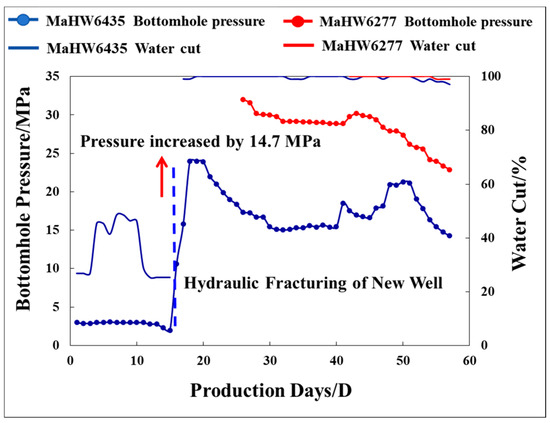 Figure 12 further illustrates the dynamic characteristics of fracturing interference through the engineering parameter evolution of a typical well group (MaHW6435-MaHW6277/6278/6279). MaHW6435 experienced interference from fracturing operations at MaHW6277/6278/6279, with its wellhead pressure surging from 2.85 MPa to 17.5 MPa. Concurrently, daily liquid production increased from 36.2 t/d to 96.6 t/d, and the water cut jumped from 35.6% to 98.6%. Notably, the production system remained in a high-pressure, high-water-cut state post-interference and did not return to baseline levels [30]. These irreversible engineering parameter changes confirm that artificial fracture networks formed during new-well fracturing established stable seepage channels with legacy well production systems, revealing that the anomalous responses in Type I characteristic wells stem from inter-well communication through hybrid artificial–natural fracture systems.