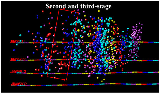 Figure 13 displays the fracture propagation patterns from microseismic monitoring during tight oil platform well fracturing. For the well group with 100 m inter-well spacing, microseismic data revealed single-well fracture half-lengths ranging from 100 to 250 m (average 150 m), with fracture systems exhibiting full planar coverage and partial intersections. If fractures extend 250 m (half-length), wells spaced at less than 500 m risk direct fracture-driven interactions, leading to parent–child well communication. When wellbores deviate from the minimum principal stress direction, hydraulic fractures develop as tensile–shear composite fractures with deflection angles positively correlated to the wellbore-stress misalignment angle. Specifically, during sequential fracturing, second- and third-stage fractures undergo deflection, whereas two-step leapfrog fracturing produces straighter intermediate fractures with reduced widths due to symmetrical stress interference from adjacent stages.