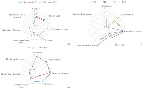 Intensity of key products’ sensory attributes for: (a) CO, CP9, CT8, and CP7 samples; (b) TO, PT2, PO, and CT5 samples; and (c) CPT6 and PT3 samples; (n = 12).