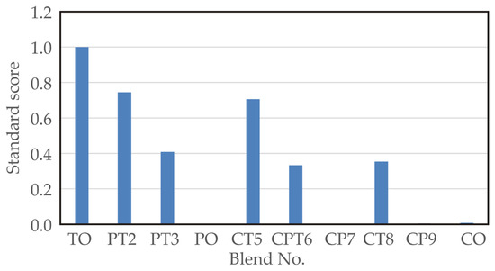 The standard score analysis aligns well with the sensory analysis, indicating that the best SS value of 1.000 was achieved by the TO sample (blend no. 1), which had a sensory score of 4.000. Slightly better sensory analysis results were observed for the PT2 sample (blend no. 2), with a sensory score of 4.417 and an SS value of 0.745, and for the CT5 sample (blend no. 5), with a sensory score of 4.25 and an SS score of 0.706.
