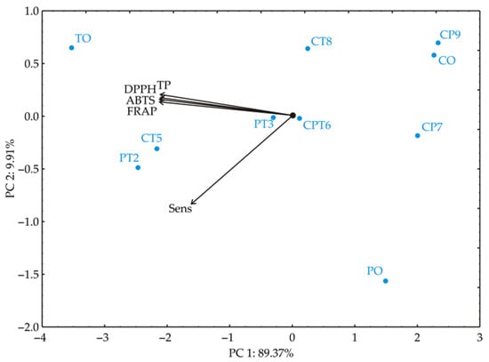 PCA was performed on the data to provide a clearer view of the similarities among samples based on their investigated properties, including TP, DPPH, ABTS, FRAP, and sensory compliance quality scores. This multivariate statistical approach enabled differentiation of samples mixed under various production conditions. The PCA biplot, which illustrates relationships among samples, showed that the first two principal components explained 99.28% of the total variance in the data (Figure 3). The analysis revealed a distinct clustering pattern among the samples, highlighting differences related to the investigated parameters.