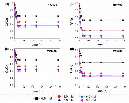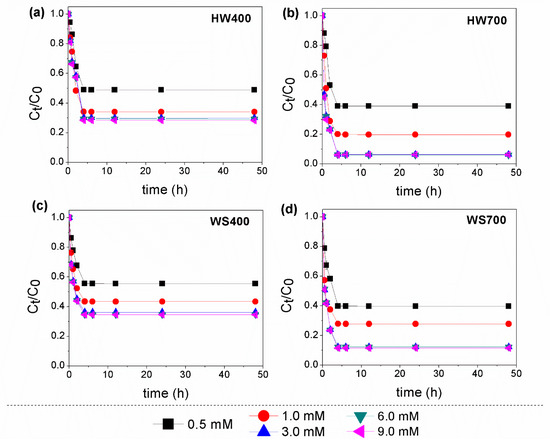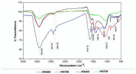 The higher pyrolysis temperature led to a richer porous structure and increased formation of volatile substances, resulting in WS700 having a significantly greater specific surface area (SSA) of 80.8 m2/g compared to WS400, which had 3.68 m2/g. Additionally, as demonstrated in our previous study [24], the notably higher SSA of HW700 (284 m2/g) indicates its potential as a more efficient sorbent for organic pollutants, offering enhanced accessibility to active adsorption sites.