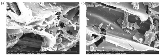 The impact of temperature on the morphology of biochars was examined using SEM to analyze both biochar. The SEM images of the prepared WS400 and WS700 biochars are shown on Figure 2. Additionally, the SEM analysis of hardwood biochar is also explained in our study [24]. The surface of wheat straw biomass was smooth with uniformly distributed pores. In the longitudinal section, a well-organized duct-like structure was observed, reflecting the regular cellular architecture of wheat straw. In contrast, the longitudinal section of WS700 displayed an irregular, fragmented appearance, indicating the onset of structural breakdown. This deterioration is primarily attributed to the collapse of the carbon skeleton at elevated pyrolysis temperatures. Similar observations were reported by [31]. Overall, the results demonstrated that both the type of biomass feedstock and the pyrolysis temperature play a crucial role in determining the morphology of the resulting biochars [31,32,33]. These morphological changes, especially the increased fragmentation and porosity observed in WS700, contribute to enhanced catalytic activity. The more developed and accessible surface area facilitates the interaction between the biochar and persulfate molecules, promoting the generation of reactive species and improving the degradation efficiency of pesticides. Therefore, the SEM morphology provides visual evidence of the structural evolution of biochars and supports the observed differences in catalytic performance.