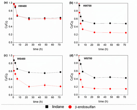 The kinetic curve for the adsorption of the pesticide mixture on all the applied biochars is shown in Figure 3. The adsorption of pesticides by all biochars increased rapidly during the first six hours, reaching equilibrium within 24 h. At a pyrolysis temperature of 400 °C, the removal efficiency of lindane was approximately 38–42% for all biochars, while for endosulfan, it was up to 78% in WS400. However, when the pyrolysis temperature was increased to 700 °C, the removal efficiency improved to 56% for lindane and 84% for β-endosulfan. These results demonstrate that biochar produced at the higher temperature of 700 °C is more effective at removing the pesticide mixture and has a higher adsorption capacity for these pesticides. The experimental results best fitted the pseudo-second-order kinetic model (R2 = 0.920–0.998) compared to the pseudo-first-order (R2 = 0.149–0.852) and Elovich models (R2 = 0.769–0.953) (Table S3 in Supplementary Materials). The obtained results suggest that chemisorption may be the dominant mechanism in the adsorption process, with the main limiting factor being the interaction between the pesticides and the active sorption sites on the surface of biochars.