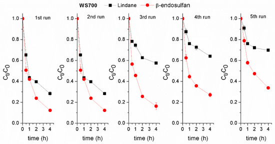 Assessment of the stability of the prepared WS700 biochar in the degradation of lindane and β-endosulfan across successive experiments. Experimental conditions: [lindane]0 = [β-endosulfan]0 = 100 µg/L; [catalyst]0 = 0.2 g/L; [PS]0 = 3 mM; pH 7.0 ± 0.2.