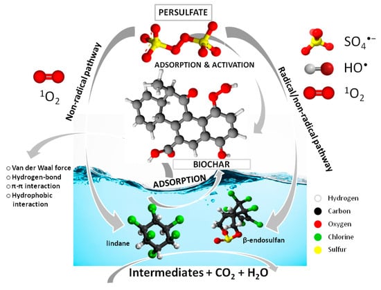 The growing levels of environmental pollutants emphasize the need for cost-effective, efficient removal methods. A range of physical, chemical, and biological methods has been employed to eliminate OCPs from water, including adsorption, membrane filtration, coagulation, advanced oxidation processes (AOPs), and biodegradation [1,13]. Recently, biochar (BC) has gained attention for its catalytic role in AOPs and its effectiveness in removing OCPs due to its high efficiency and availability [14,15]. Biochar, produced through pyrolysis of biomass in anaerobic conditions, has unique characteristics such as a microporous structure, abundant functional groups, large surface area, and high porosity, which make it effective for pollutant removal and environmental remediation [16]. Biochar is also a potent activator of persulfate (PS) for degrading organic pollutants, likely due to its oxygen-containing functional groups [17,18]. In contrast to traditional AOPs that produce hydroxyl radicals (HO•), sulfate radicals (SO4•−) in the BC/PS system have higher redox potential, a broader pH range, and longer half-lives [16]. Organic pollutant degradation in BC/PS systems occurs via both free radical and non-radical pathways. The free radical pathway involves biochar’s catalytic sites cleaving the O-O bond in PS, forming SO4•−, HO•, and superoxide ions (O2•−), while the non-radical pathway involves singlet oxygen (1O2), electron transfer, and surface complexes [19] (Equations (1) and (2)).