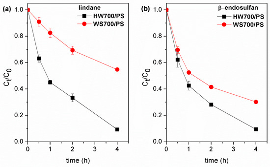 Effect of pH. It is well known that solution pH has a significant impact on AOPs by affecting the generation of ROS and the charge on the catalyst surface [39,40]. Therefore, to achieve effective oxidative degradation, it is important to consider the dissociation constants of the target pollutant as well as the catalyst’s point of zero charge [14]. To investigate this, the degradation of lindane and β-endosulfan by HW700- and WS700-activated PS at different pH values was examined (Figure 6). The pesticides removal in HW700/PS system efficiency increases slightly with pH, exceeding 90% when the pH reaches 7 and 9.5. An exception is observed in the WS700/PS system, where a slightly lower removal efficiency was noted during Lindane degradation, with values between 67% and 72% at pH levels ranging from 5 to 9. The relatively slow removal of pesticides under acidic conditions may be attributed to the fact that an excess of H+ ions can neutralize SO4•− and HO• (Equations (6) and (7)) [41]. Additionally, a high concentration of H+ can stabilize PS, further inhibiting PS activation and ultimately reducing pesticide degradation.