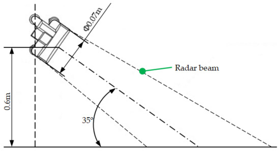The basic requirement of speed-dependent control of granular fertilizer is to obtain high-precision forward speed of the machinery and achieve accurate control of fertilizer amount by the target fertilizer amount, the machinery width, and the number of fertilization rows. A high-precision speed measurement sensor is the key to improving the control system’s performance. The machinery’s inaccurate forward velocity can significantly affect the fertilizer application control, resulting in excessive or insufficient fertilizer application and affecting crops’ growth and yield. Various agricultural machines have been equipped with speed sensors based on Doppler wave technology. Using the sensor, the forward speed of the machinery can be computed with a microwave (radar) signal based on the Doppler frequency shift principle (by measuring the frequency change of the reflected signal). Since microwave (radar) signals can provide reliable and accurate speed signals and can take accurate and reliable speed measurements without the use of the rotation information of the wheel or the transmission shaft, the measurement error caused by sliding or deformation of wheels on account of the variations in load and ground conditions can be eliminated. High-speed measurement accuracy can be maintained even at low speeds. Foreign radar speed sensors are always at a price of over CNY 6000~7000 (i.e., USD 840–980). Only a few Chinese radar speed sensor manufacturers can produce comparable products. Based on the background of school-enterprise cooperation, this study selected high-precision radar speed measurement sensors developed by the cooperative enterprises to adapt to speed measurement in paddy fields and dry lands with sensitive reactions and no delay. The radar speed measurement sensor is approximately 0.6 m above the ground, facing the rear of the machine with an included angle of 35 degrees with the ground. The minimum speed measurement limit can be as low as 0.1 m/s, and it has good robustness to uneven road surfaces and the movement of mechanical bodies. However, the price of the used sensor in this study was only one-third of the price of the foreign product, as the standard installation method shown in Figure 1.