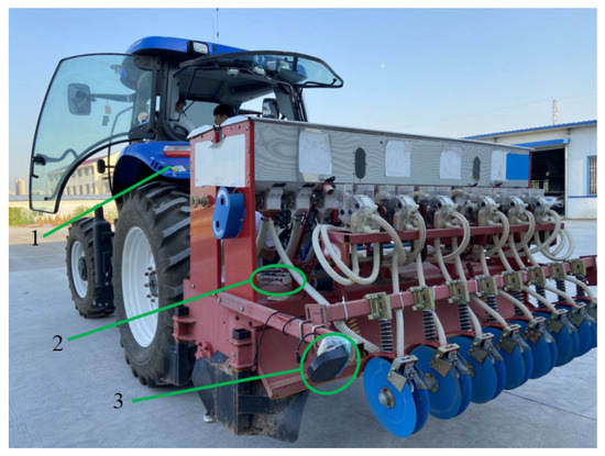 Present data acquisition site by the radar speed sensor: 1—case unmanned navigation tractor; 2—speed-dependent fertilization control terminal; 3—radar speed sensor.