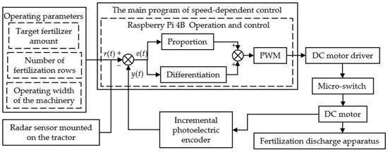 The speed-dependent fertilization control system mainly consisted of the control program and hardware. Specifically, the hardware mainly included a human–machine interface, information acquisition, an electric drive module, and the controller. The controller calculated the target rotation speed according to the machinery’s operating parameters and the collected speed information, simultaneously compared with the actual rotation speed, and adjusted the corresponding PWM square wave signal and output to the driver of the DC motor via the PD control algorithm. The driver amplified the input control logic-level PWM square wave into the square wave with the motor’s operating voltage as the peak value but unchanged duty ratio and frequency.