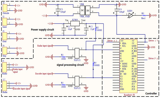 Considering that the seeder always operates in the field for a long time, the 12 V battery mounted on the tractor acted as the main power of the control system. Before connecting with the main power, the control system was equipped with a secondary power supply (12V5A battery) for debugging convenience. The secondary battery can be charged when the control system is connected to the main power. Using the VRB1205YMD-20WR3 power module, the voltage at 12 V was reduced and stabilized to the voltage at 5 V; using the K7805-500 power module, 12 V was reduced and stabilized to 3.3 V. Figure 5 shows the schematic diagram of signal processing and power supply circuit.