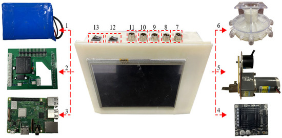 Hardware composition of the developed speed-dependent fertilization control system: 1—secondary power source; 2—main power source and signal processing module; 3—Raspberry PI; 4—motor driver; 5—motor and photoelectric encoder; 6—fertilizer discharge apparatus; 7—encoder port; 8—radar port; 9—motor of the fertilizer discharge apparatus; 10—motor of the seeder; 11—port of the main power source; 12—switch of the main power source; 13—switch of the secondary power source.