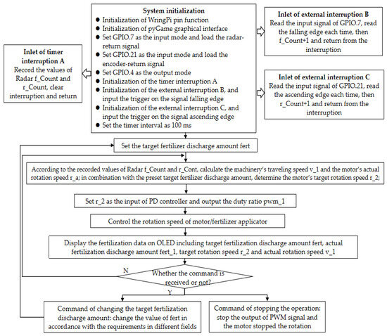 After the control program started, the Raspberry PI finished the system initialization; meanwhile, the display screen and the clock finished the initialization, and the timer was started. The data processed by the radar sensor and the signal acquisition module of the encoder acted as the external interruption of the Raspberry PI pin. The counting program constantly updated the number of ascending edges in the return signal. The operating speed and the motor’s actual rotation speed were calculated. In combination with the preset target fertilizer amount, the PMW duty ratio was calculated and output to drive the rotation of the motor. Meanwhile, the fertilization data were displayed on the OLED screen in real time. The flowchart of the fertilization control program is shown in Figure 7.