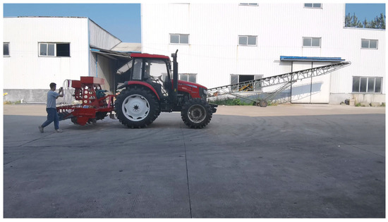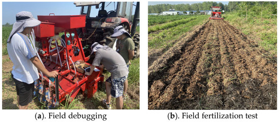A constant-speed performance test was conducted to assess the error between the actual fertilizer amount and the target value when the machinery moved at a constant speed after the regulation by the control system. In this study, the experiment complied with the Technical Specification for Quality Evaluation of Fertilizing Machinery (NY/T 1003-2006), an agricultural industry standard of the People’s Republic of China [26], which specifies that the fertilization amount deviation (referred to as relative error in this paper) should be ≤15%. The Dongfanghong LX954-C tractor (China Yituo Group Co., Ltd., Luoyang, China.) was used, and the 12 V battery mounted on the tractor acted as the power source of the control system. During the test, the tractor operated in the field without stopping for 100 m; according to the fertilizer requirements, the minimum, medium, and maximum fertilizer application rates were set as the target fertilization amounts, respectively. That is, three groups of different target fertilizer discharge rates of 225, 375, and 525 kg/hm2 were established. Stanley compound fertilizer was used as the granular fertilizer in this study. The granular fertilizer was collected at the end of various fertilizer pipes with the bags and weighed. Figure 8 displays the test site.