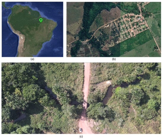 The village of Janari and the Água Preta stream. (a) Brazilian territorial overview with Janari marker (Google Maps). (b) Local-scale view of the village of Janari. (c) Top view image of the actual stream bridge site within the study area.