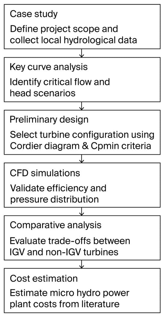 This methodology outlines a systematic approach for designing and evaluating hydraulic turbines, integrating technical and economic analyses. Figure 2 illustrates the methodology. It begins with a case study to define project scope and collect local hydrological data, followed by key curve analysis to identify critical flow and head scenarios. Turbine configurations are preliminarily selected and designed using the Cordier diagram and Cpmin criteria for high efficiency.