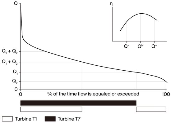 - The exclusive operation of the larger turbine when Qp > Qriver > Q1;