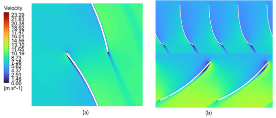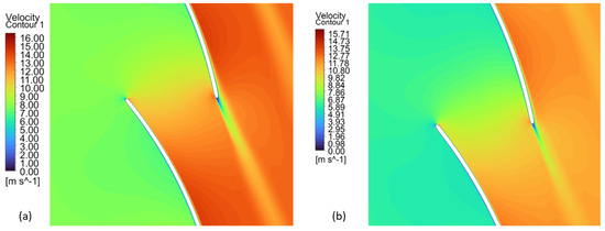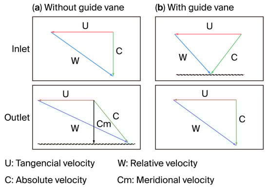 where U is the blade speed and Cu is the difference in tangential components of the absolute velocity at the rotor inlet and outlet. Without an IGV, the incoming flow exhibits higher relative velocity (W) (Figure 4a) and unfavorable incidence angles, leading to excessive aerodynamic loading on the rotor blades. This overload increases separation risks and reduces efficiency. Including an IGV rectifies this issue by imparting pre-swirl (Cu1) to the flow, aligning it with the rotor blade angle and reducing W (Figure 4b). This adjustment ensures smoother energy transfer.