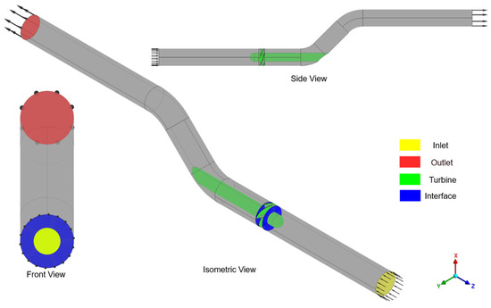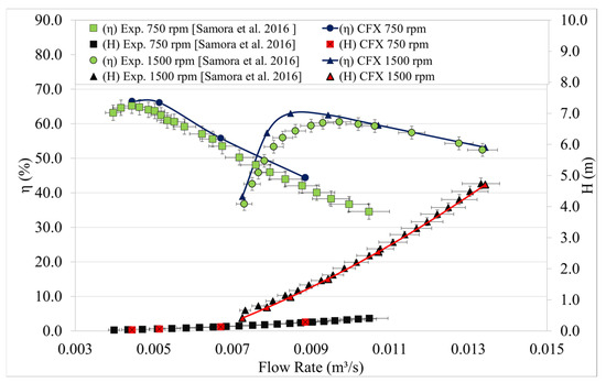 The computational fluid dynamics (CFD) approach used for turbine performance assessment was validated against experimental measurements from an axial-flow turbine (Figure 6), which was tested under various rotation speeds and discharge conditions. Numerical simulations were performed using ANSYS CFX 2024 R2, employing a one-phase flow framework.