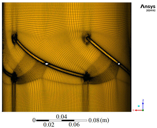 To accurately resolve near-wall turbulence effects, localized mesh refinement was implemented within the boundary layer regions. The initial cell layer height was calibrated to maintain dimensionless wall distances (y+) < 1 across all blade surfaces (Figure 7). A progressive expansion factor of 1.05 between adjacent layers ensured smooth transitions of prism elements while preserving gradient resolution accuracy for the SST k-ω equations. A mesh independence assessment evaluated four configurations (3.4–5.6 million elements) through monitoring of hydraulic efficiency (η) and head (H) (Table 1). The optimal configuration (4.1 million elements) exhibited variations of less than 2% in η and H relative to the finest mesh, satisfying the Grid Convergence Index (GCI) requirements. CFD simulations replicated experimental data with discrepancies of under 5% in both efficiency and pressure distributions, confirming the model’s reliability for ultra-low-head turbine applications.