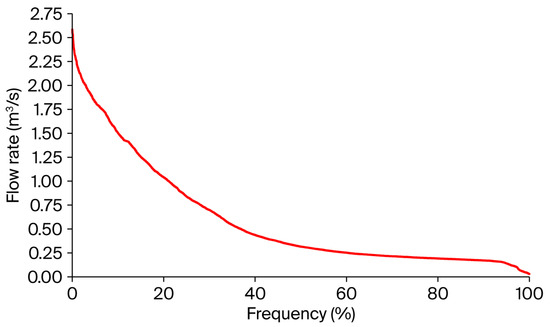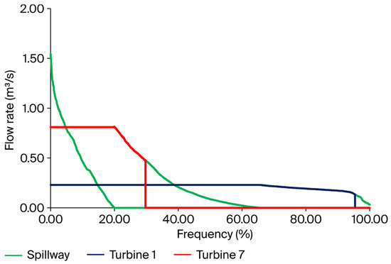 The turbine flow rates were determined based on the site’s flow (Qriver) duration curve, which indicates the frequency at which specific flow rates occur throughout the year. The smaller turbine (Q2) was designed to operate at Q95% (the flow rate exceeded this 95% of the time), ensuring continuous operation throughout the year.