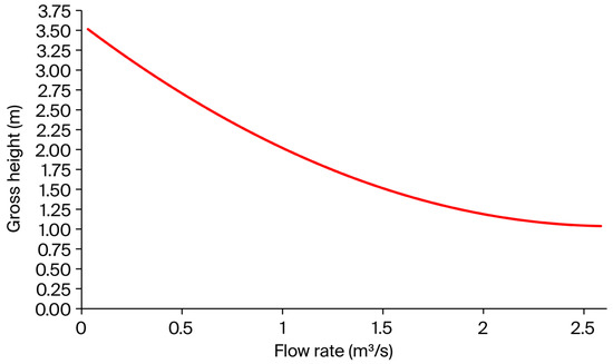 Figure 11 presents the site’s gross head variation as a function of the river flow rate, which is defined by its flow duration curve. Both turbines operate at a constant flow rate, except during the initial starting operation, when the flow rate varies from 80% to 100% of the design flow rate. With the powerhouse configuration, the head losses in the penstock and draft tube can be calculated, giving the net head.