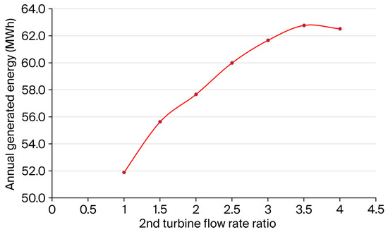 For the larger turbine (Q1), iterative configurations were tested in increments of 0.5 times the smaller turbine’s flow rate. The total design flow rate (Qp) corresponded to the combined flow rate in each case (Q1 + Q2). The annual energy generated was calculated by integrating the power produced over time, considering the following: