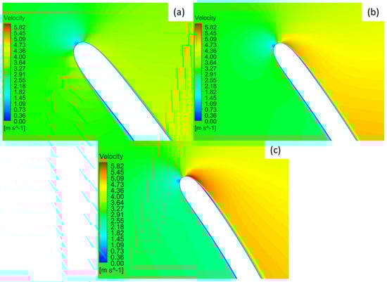 where p denotes static pressure on the blade surface, p0 is the upstream pressure, and w∞ reference upstream relative velocity. A minimum Cp value must be maintained on the blade’s suction side at the hub section to ensure optimal aerodynamic loading, as established by [18,19,20]. Muis et al. [19] applied this principle to obtain an efficiency of 91% in a very low-head axial flow turbine design.