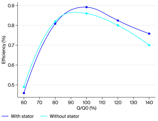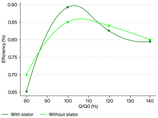 Figure 21 and Figure 22 illustrate specific operating points at which the efficiency of the stator-equipped setup is lower than that of the stator-free setup.