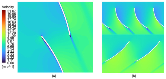 Turbine relative velocity at the hub section of the blade at Q = 1.2Q0 for T7. Without IGV (a) and with IGV (b).