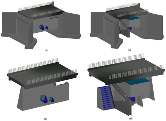 Three-dimensional model views of the dam-bridge structure: (a) upstream view highlighting the wing walls; (b) downstream view highlighting the wing walls; (c) general upstream perspective; (d) general downstream perspective.