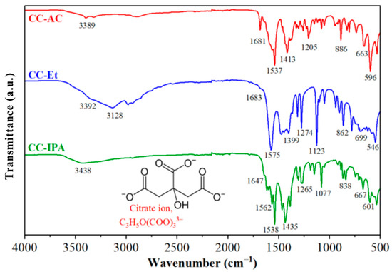 The chemical structure and atomic bonding interaction of citrate ions are presented in the inset of Figure 1. The absorbance band at the wavenumber range between 3650 and 3240 cm−1 is assigned as the vibrational mode of the O–H stretching of the hydroxyl functional (–OH) group of the citrate (C6H5O73− or C3H5O(COO)33−) ions [5]. It can be seen that among the synthesized samples, the calcium citrate prepared from the reaction in the presence of isopropanol (CC-IPA) showed the highest absorption energy (~3438 cm−1). This finding indicated the strongest chemical bonding between O and H atoms for the CC-IPA sample, whereas absorption bands at around 3392 and 3389 cm−1 were observed for CC-Et and CC-AC, respectively. Moreover, the stronger absorption band for the O–H stretching of the CC-Et sample, compared to other samples, pointed out the highest amount of hydroxyl groups. The vibrational band at a position of 3128 cm−1 also corresponded to a vibrational mode of the O-H bond [6,39].