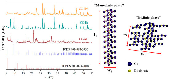 Figure 2. X-ray diffraction (XRD) patterns of the synthesized calcium citrates prepared by the reaction between CaCO3 derived from mussel shell waste and citric acid in the presence of acetone (CC-AC), ethanol (CC-Et), and isopropanol (CC-IPA). Molecular alignments of monoclinic and triclinic crystal systems of calcium citrate [30].