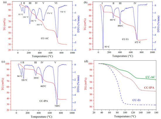 Table 3. Starting and ending temperature points of each thermal decomposition process obtained from the TG and DTG curves of CC-AC, CC-Et, and CC-IPA.