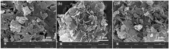 The utilization of organic solvents is an important factor that influences the colloidal assembly mechanism and the particle growth process during material synthesis [45]. Interactions between the solvent molecules and ligand molecules or surface particles can affect the morphology and particle size [46]. In the present work, a scanning electron microscope (SEM) was utilized to observe the morphological characteristics of the synthesized calcium citrates. The particle sizes of the samples were directly measured through the SEM images. According to the SEM results (Figure 4), the particle morphologies of all CC-AC, CC-Et, and CC-IPA powders are in irregular forms of thin sheets (sheet-like structure); however, these irregular thin sheets are rather scattered with particle sizes from around 50 nm to 1.2 μm.