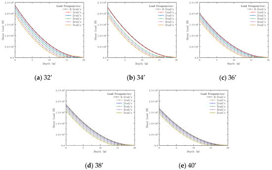 Variation of shear load with conductor outer diameter and depth under different external load frequencies. Outer diameters: (a) 32’; (b) 34’; (c) 36’; (d) 38’; (e) 40’.