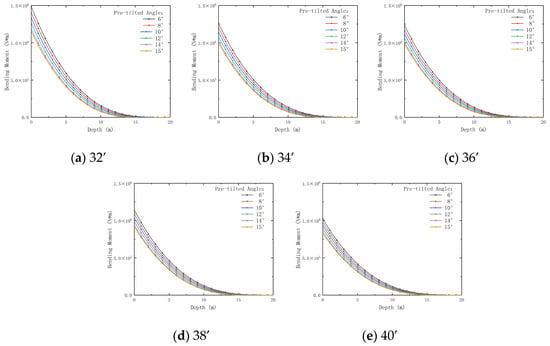 Variation of bending moment with conductor outer diameter and depth for pre-tilted conductors with different inclination angles. Outer diameters: (a) 32’; (b) 34’; (c) 36’; (d) 38’; (e) 40’.