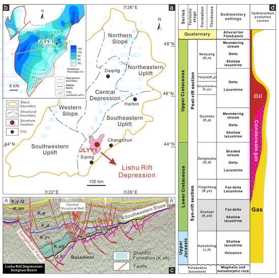 The JLYY1 borehole investigated in this study is situated in the eastern slope zone of the Lishu Rift Depression within the Southeast Uplift of the Songliao Basin (Figure 1). The Lishu Rift Depression, covering a total area of 2822 km2, is notable for having the longest rifting period, the most complete stratigraphic development, the thickest sedimentary deposits, and the deepest burial in the southeast uplift area of the Songliao Basin. This depression contains two primary sets of strata: the syn-rift and post-rift sections (Figure 1d). The syn-rift section has a thickness ranging from 0 to 8000 m, with a maximum burial depth exceeding 10,000 m. This section contains the Cretaceous Huoshiling Formation (K1h), Shahezi Formation (K1sh), Yingcheng Formation (K1yc), and Denglouku Formation (K1d), filled with lacustrine and fan delta deposits [,]. The post-rift section mainly consists of the Cretaceous Quantou Formation (K2q), Qingshankou Formation (K2qn), Yaojia Formation (K2y), Nenjiang Formation (K2n), and Quaternary strata, characterized by fluvial, deltaic, and lacustrine facies deposition []. The Shahezi and Yingcheng Formations are the primary intervals of thick shales developed during the significant rifting subsidence period.