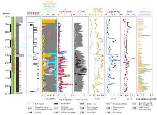 Comprehensive stratigraphic section of the lacustrine-dominated interval within the Shahezi Formation (JLYY1 borehole, Lishu Rift Depression), illustrating the vertical variations in lithology, facies associations (FA1–FA7, after Wang et al., 2025) [], mineral composition, total organic carbon (TOC) content, pyrolysis logging proxies (S0, S1, S2, and S4), geochemical indicators, and total gas content (TGC). The Al/Ti ratio is used to infer paleoclimate conditions (humid vs. dry), while the (Al + Fe)/(Ca + Mg) proxy reflects paleowater depth. Sr/Ba and Ca/(Ca + Fe) ratios are employed to differentiate paleosalinity (freshwater vs. saline lake), the Zr/Ti ratio indicates the input intensity of volcanic materials, and the U/Th ratio serves as an indicator of bottom-water paleoredox conditions.