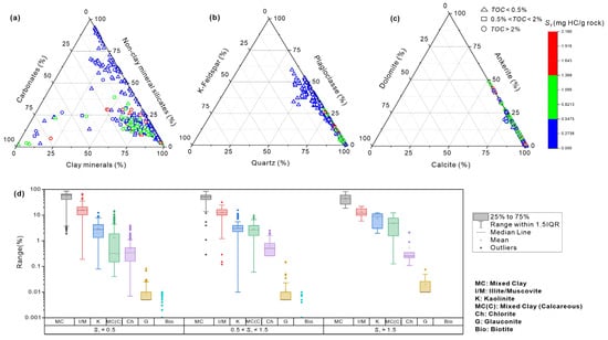 Ternary (a–c) and box (d) diagrams showing the correlation between RoqSCAN mineral composition, total organic carbon (TOC) concentrations, and pyrolysis S1 values. S1 values are used to indicate the contents of liquid hydrocarbons.