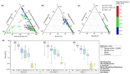Ternary (a–c) and box (d) diagrams showing the correlation between RoqSCAN mineral composition, total organic carbon (TOC) concentrations, and total gas contents (TGC). TGC values are used to indicate the contents of liquid hydrocarbons.