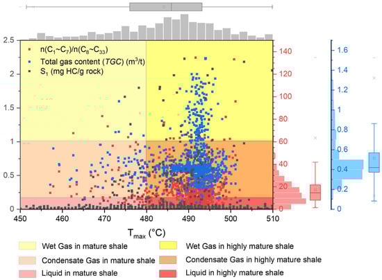 To illustrate the influence of thermal maturity and hydrocarbon phases on the hydrocarbon content, parameters of S1, TGC, and HSCI are used to make a statistical scatter chart where Tmax is settled as the x-axis, black points indicate the S1 values, and blue points indicate the TGC values, as shown in Figure 5.